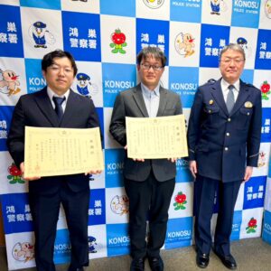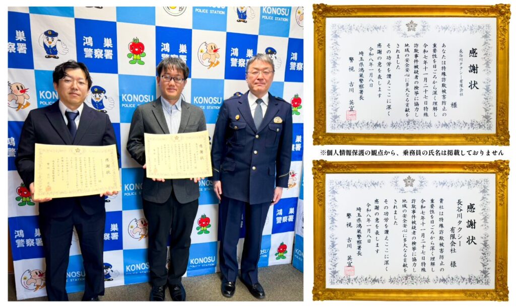 鴻巣警察署 警察署長様より、乗務員ならびに長谷川タクシー有限会社へ感謝状を授与されました。