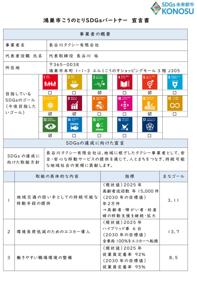 長谷川タクシー有限会社は、2025年に鴻巣市が推進する「こうのとりSDGsパートナー」として登録されました。